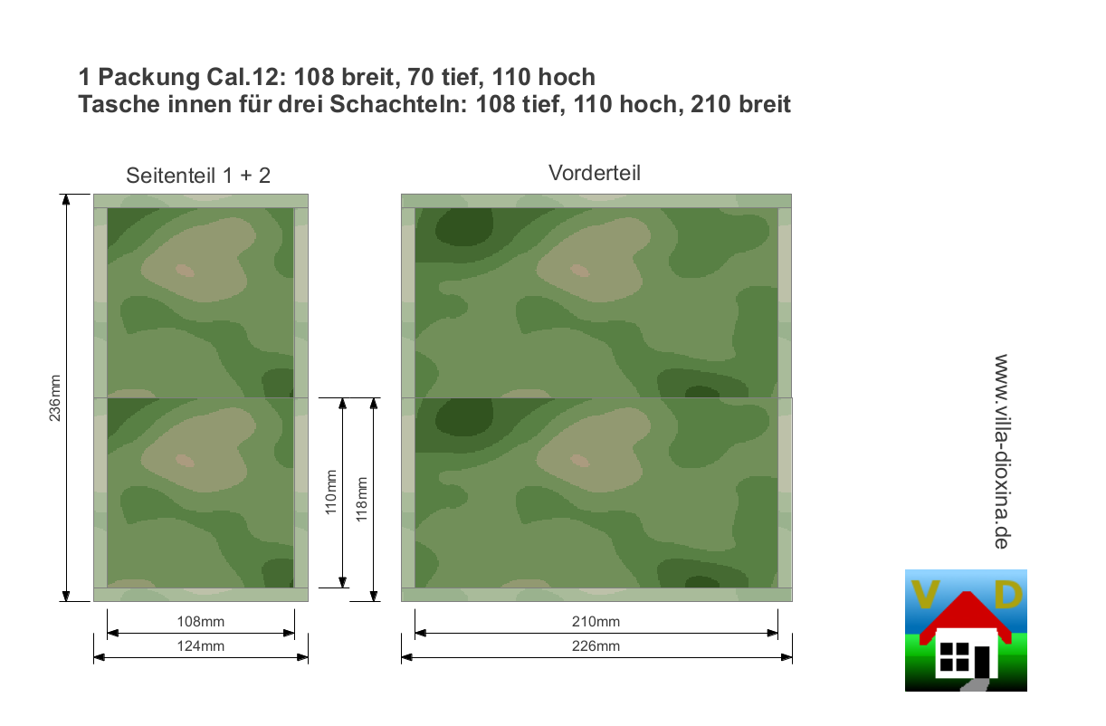 Eine 25er Schachtel Patronen im Kaliber 12 hat die Maße 108x70x110mm³ (BxTxH), mit etwas Zugabe für Handling und unsauberes Arbeiten [flöt] setzte ich die Innenmaße der Tasche auf 108x110x210mm³ (TxHxB) fest. Als Nahtzugabe für meine groben Klauen setzte ich 8mm an. Um die Wände etwas stabiler und fülliger zu machen, besorgte ich noch etwas Füllvlies und zur Verschönerung der Kanten ein paar Meter Schrägband. Den ganzen Krempel gibt es preiswert bei eBay, im Kaufhaus wird es gleich richtig teuer - warum eigentlich? Als Prämie, wenn man die Verkäuferin endlich gefunden und zur Hilfe überredet hat? Die müsste doch aber der Kunde kriegen (also die Prämie)?!