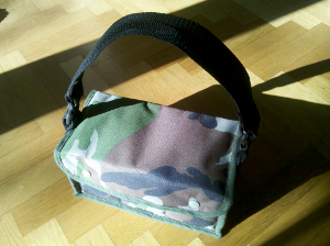 Passenden Stoff gibt es in der Bucht unter Cordura oder Segeltuch. Man nehme eine möglichst schwere Kunstoffqualität. Viel braucht man nicht, aber man kann natürlich noch ganz andere Sachen daraus machen: Tarnquilts für die Jagdhütte, abriebfeste Hosen für den Nachwuchs oder einfach noch jede Menge anderer Taschen und Etuis.