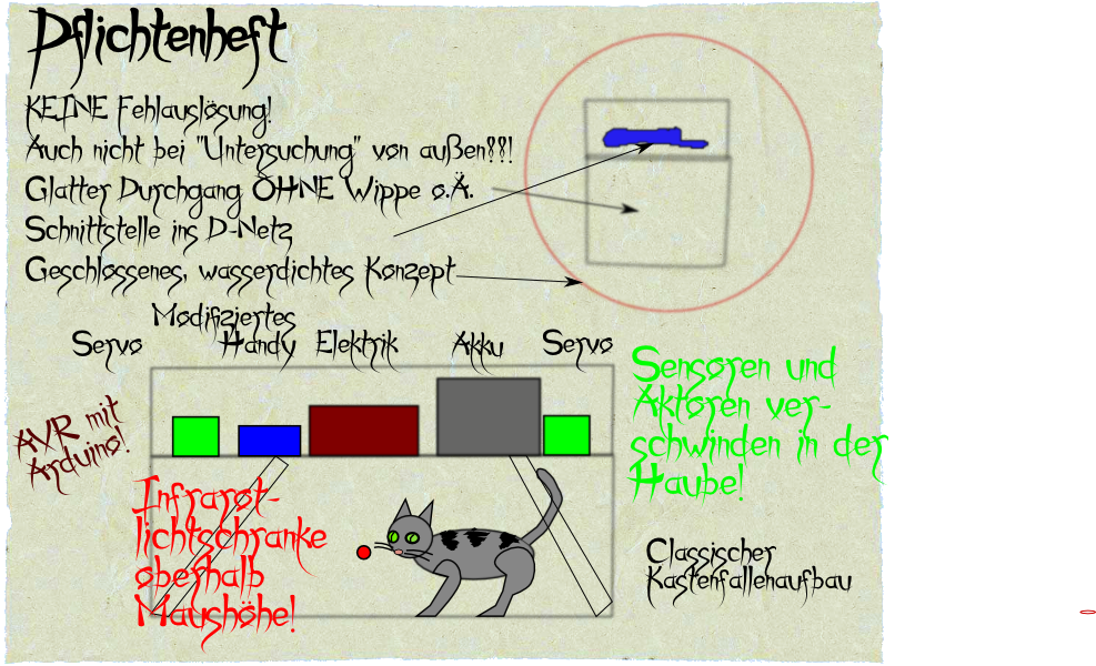 Die Idee: Auslösung über eine unsichtbare Lichtschranke in Katzen-/Waschbär-/Fuchshöhe, sodass Mäuse die Falle nicht auslösen. Dadurch entfällt auch die Wippe, welche das Raubwild/-zeug misstrauisch macht. Die komplette Steuerung mit den Servos wird gekapselt, somit können die Probanden draussen auf der Falle herumspringen wie sie wollen, sie wird nicht auslösen!